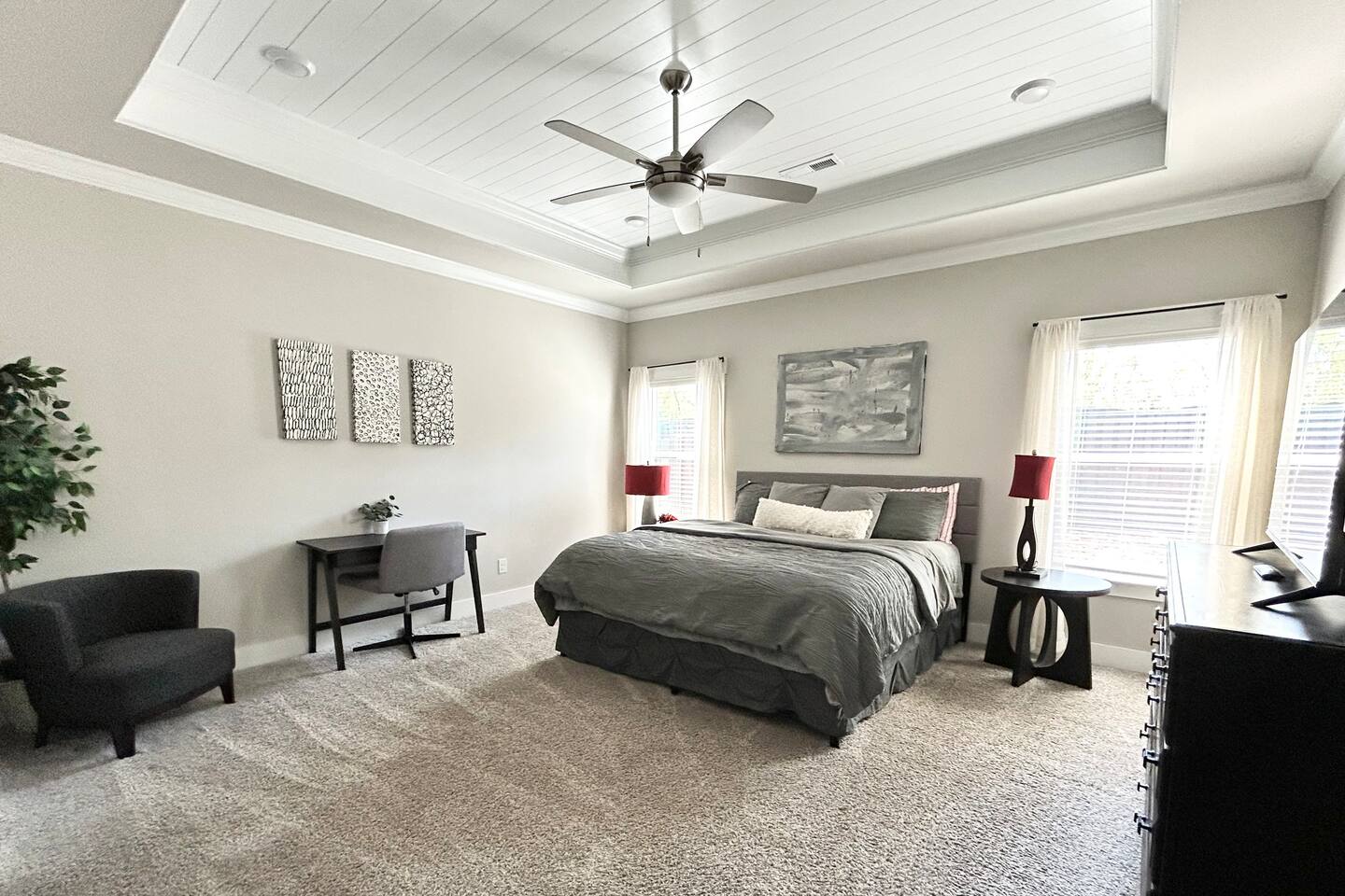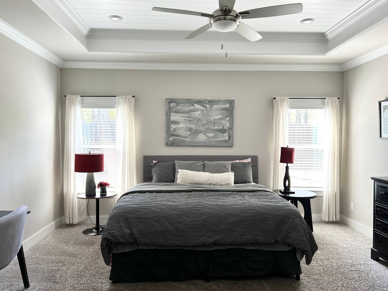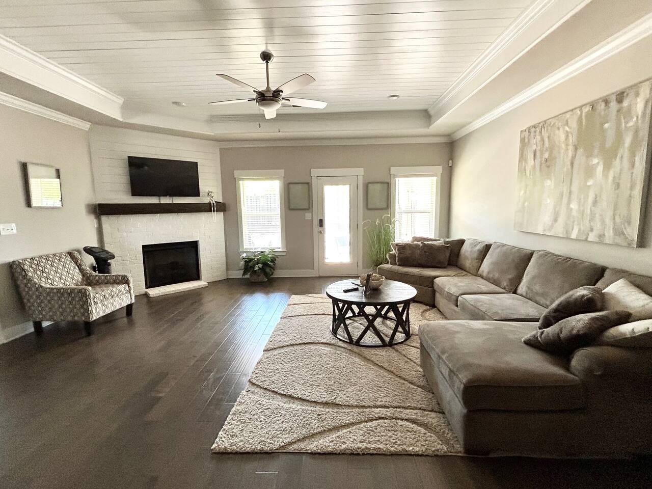 🛏️ Master Suite: Relax in a plush king bed surrounded by modern furnishings and large windows. The ensuite bathroom features a luxury spa shower and a separate soaking tub to unwind after a busy day. 🛏️ Additional Bedrooms: Two comfortable bedrooms with cozy bedding provide restful space for family or colleagues. 🍳 Kitchen: A large gourmet kitchen awaits the chef in your group, equipped with a gas cooktop, granite countertops, dishwasher, and a full array of cooking basics and appliances, including a rice maker and blender. 🛋️ Living Area: The open floor plan creates a bright and inviting space with comfortable seating, and one of four smart TVs perfect for streaming your favorite shows from your personal accounts. 💻 Workspace: Stay productive in a dedicated office corner featuring a laptop-friendly desk and high-speed ethernet for reliable connectivity. 🎲 Entertainment: Enjoy family fun with board games, puzzles, and even a karaoke machine. 🌳 Outdoor Space: Step into a fully fenced private yard with outdoor seating, perfect for al fresco dining or relaxing after a day exploring nearby walking and biking trails. 🚗 Garage & Parking: Benefit from secure 2-car garage parking and easy access to the home’s private entrance. 📍 Location: Less than 5 minutes from Redstone Arsenal Gate 7, Toyota Field, and upscale dining and shopping at Town Madison. Publix is just a short walk away for convenience. With all these comforts wrapped in a quiet, safe neighborhood, this retreat is your perfect base for family vacations, business trips, or attending local events. Book now to experience Huntsville hospitality at its best!
